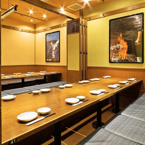【ゆったり寛げる個室】長時間の宴会でも脚を伸ばしながら寛げる掘りごたつございます。快適な空間で大人数の飲み会にもしっかり対応◎宴会向けの飲み放題付きコース料理や、幹事様にも嬉しいクーポンも多数ご用意しております!仕事終わりにも気軽にお立ち寄りください。