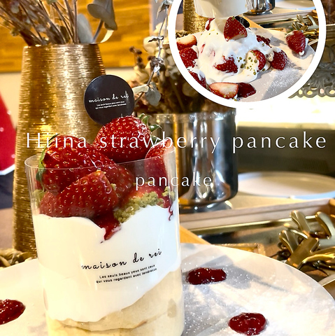 ひいな農園さんのイチゴを贅沢に使用したパンケーキ。フィルムを上げると流れ出すイチゴと生クリームが動画映えします!