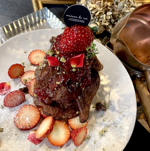 ひいな農園さんのイチゴに濃厚なチョコソース、酸味の効いたベリーソースを。さいごに自家製チョコクレープで包んだボリュームもあるパンケーキです。
