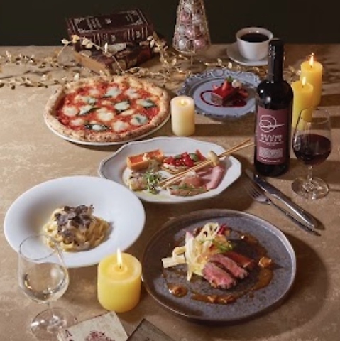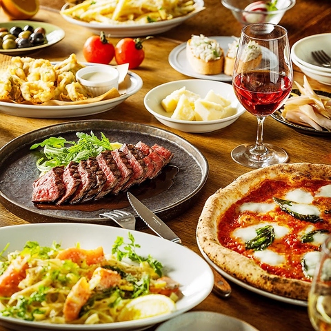 前菜・サラダ・フリット・温菜・ピッツァ・パスタ・牛ステーキ・ドルチェに飲み放題が付いた贅沢なコース。満足すること間違いなし♪+¥500/1人でトリュフのピッツァに変更出来ます。