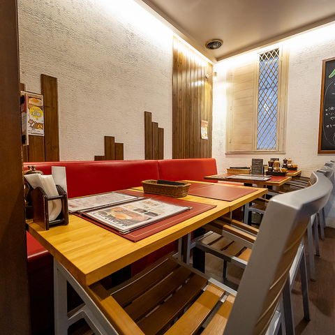 奥には真っ赤なソファ席。ご家族でのご利用やデートにも◎2名様席、4名様席あり。人数に合わせてご利用くださいませ!