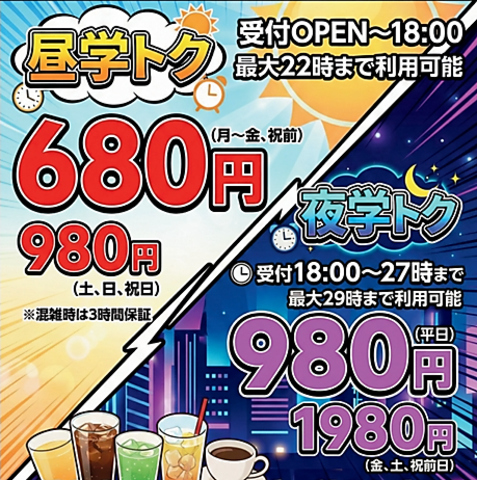 昼:680円/土日980円※最長11H(混雑時3H保障) 夜:980円/週末1,980円※最長10H 詳しくは店舗へどうぞ!