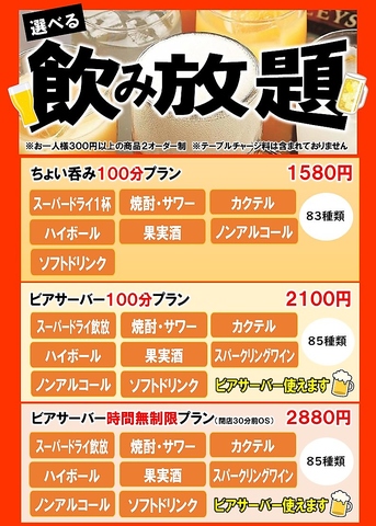 | 飲み放題 | あり :1580円から2880円 |