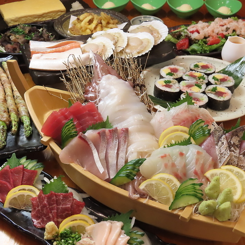 このコースは、前菜3種から始まり、大根と明太子のサラダ、やりいか姿造り入りの新鮮な刺身3点盛りが提供されます。そして、親鶏の鉄板焼きと、いかの姿造りを天ぷらにしたイカの天ぷらの2品を楽しめます。鍋物は水軍もつ鍋、締めにはちゃんぽん麺、そしてデザートで終わる、海の幸と肉料理をバランス良く組み合わせた充実の内容です。120分飲み放題付き♪