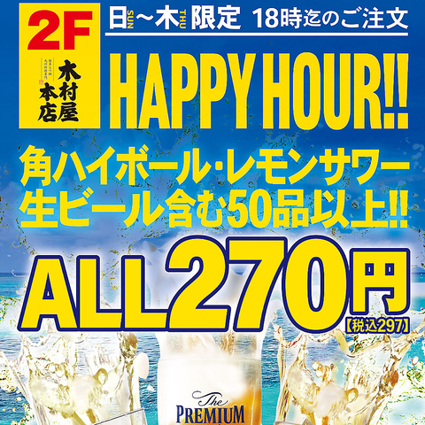 ハッピーアワー開催中♪生ビールも角ハイボールも270円(税抜)!他にも全50品以上が対象になっています♪