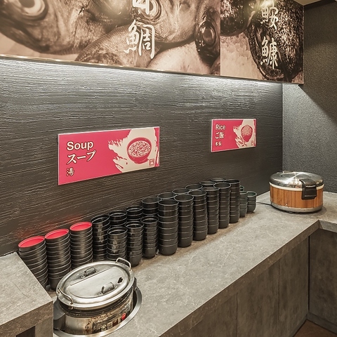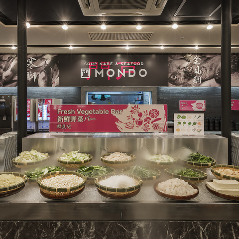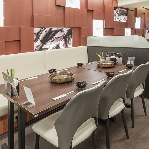 野菜や他鍋具材等40種以上、ご飯や味噌汁、ソフトドリンクやアイスキャンディーも全て食べ放題!店内は木目を基調とした温かみのある和のデザインに、洗練されたモダンなインテリアが融合したお洒落な雰囲気です♪柔らかな照明が各テーブルを優しく照らし、落ち着いてお食事を楽しめる大人の隠れ家のような空間を演出しています◎