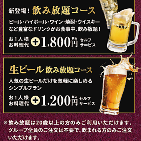 瓶ビールを除く全てのアルコール飲み放題!を¥2,000でどうぞ!※バイキング料理と同時のお申込みとご利用が必須です。バイキング料金とは別で飲み放題料金が発生します。※セルフサービス制。