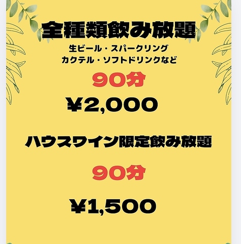 生ビール、スパークリング、カクテルなど多数ディナー限定90分全種類飲み放題2000円!