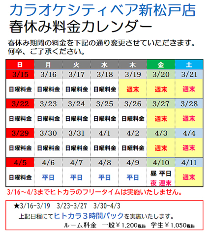 3月16日~4月3日まで料金に変更がございます。ご了承ください。詳細は店舗までお電話で。