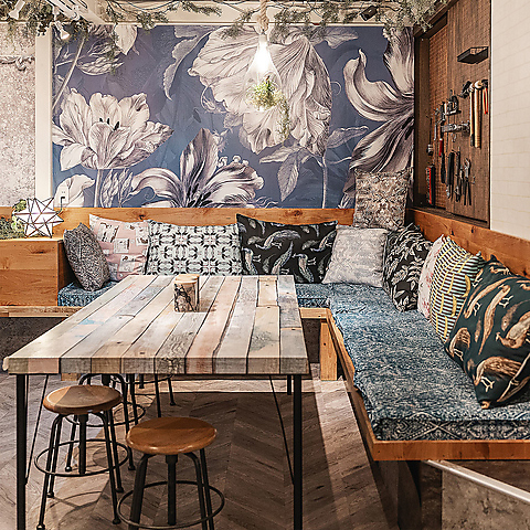 インテリア商品販売会社がプロデュースした店内は、お洒落な家具や内装などのインテリアも楽しめるのが特徴。 壁には友安製作所が販売しているファブリックボードやインテリア雑貨が飾られていたり、輸入壁紙やタイルシールでDIYを施しています。 おしゃれな空間でゆったりと贅沢なひと時をお過ごしいただけます。