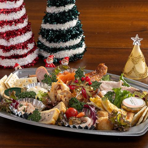 ローストチキン・キッシュ・スモークサーモン・ライスコロッケ・小柱と海老のカクテル・シーフードのマリネ・チキンロール・ローストポーク・イベリコ豚のパテ・フランクソーセージ・ポテトサラダ・クラッカー付瓶詰2種(北海道産クリームチーズのペースト/北海道産豚のリエット)