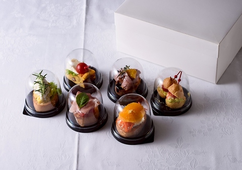 ピッツェリアアメニータオリジナルのピンチョスです。1個350円から400円のピンチョスをショーケースより6個お選びください。最大400円お得です。
