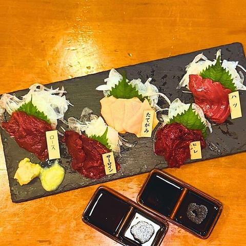 新鮮さ抜群な馬刺しは盛り合わせなら、サーロイン、ヒレ、カルビ、タテガミなど色々な部位が楽しめます。