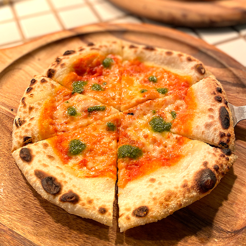 こだわりの配合で作るピザ生地。1枚1枚丁寧にトッピングし、約500℃の店内のピザ窯で焼き上げます♪