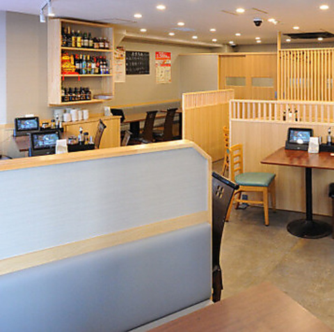 円卓が角テーブルに囲まれた店内はゆったりスペース。細田65名様までの宴会が可能です。