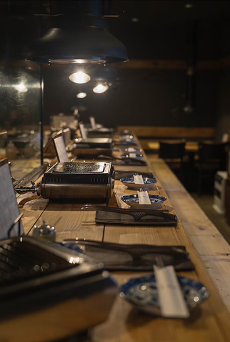 外灯に照らされる当店では他のお店と少し異なる外観。店内に一歩入るとカウンターが広がり、目の前にはオープンキッチンが。キッチンのライブ感を楽しみながら焼肉をお楽しみ頂けます♪