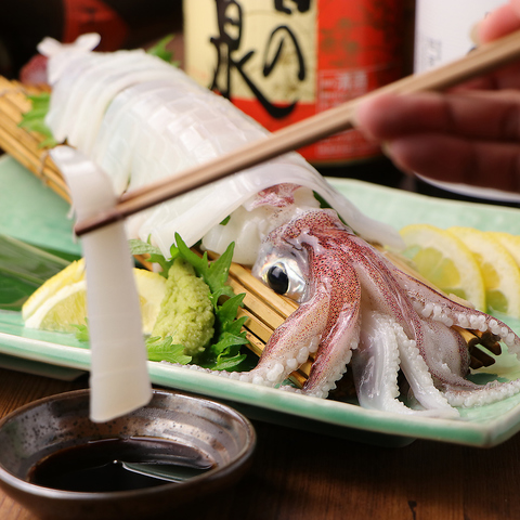 呼子直送の朝〆イカをご用意しております。身はやや白っぽい半透明で身が厚くモチモチした歯ごたえがあり、噛めば噛むほど甘み・旨味が広がります♪鮮度抜群の活きアジの姿造りも人気メニュー!《乾杯ドリンクがお得》毎日OK!乾杯生ビール100円!!
