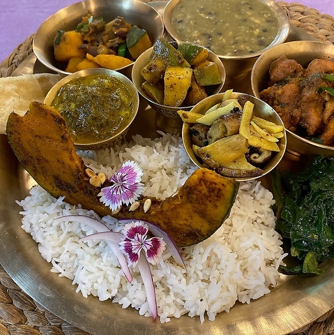 ネパール語で「お花畑」を意味する『フルバリ』。お花畑のように彩り豊かに盛り付けられた、数種類のネパールカレーが味わえる大満足のランチメニューです♪