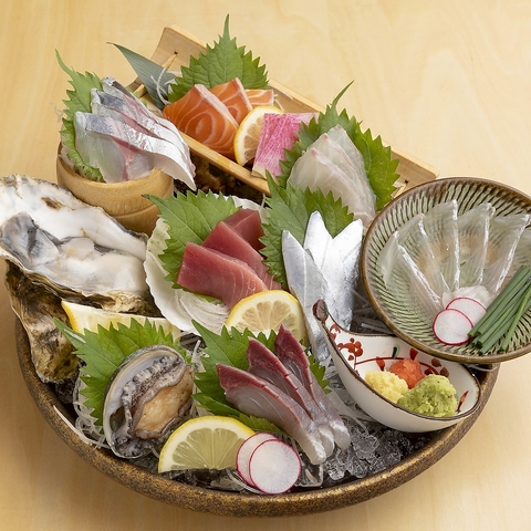 当店名物! 鮮度抜群の魚介の刺し盛り。佐賀関鮮魚や活き姫あわびなど、その日に獲れた新鮮な地魚やブランド魚を贅沢に盛り込みました。※内容はその日の入荷により変更になる場合がございます。