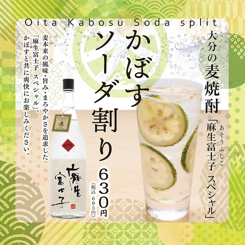 爽やかな大分県産かぼすの香りと、大分の麦焼酎「麻生富士子」のコクが調和した一杯。炭酸で割ってスッキリ爽快、食事とも相性抜群!軽やかでありながら、しっかり満足できる味わいです。