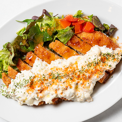 ザクっと揚げ立て国産若鶏のチキンカツレツに特製甘酢だれと自家製の生タルタルソースをたっぷりのせた逸品★