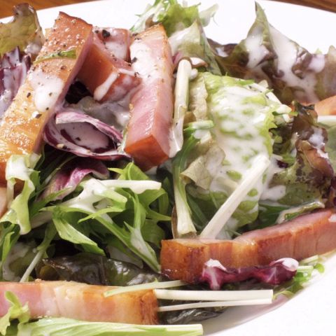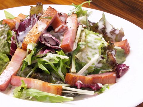 自家製の燻製ベーコンをつかった特製のシーザーサラダ。野菜もたくさん取れて健康的で女性に人気♪
