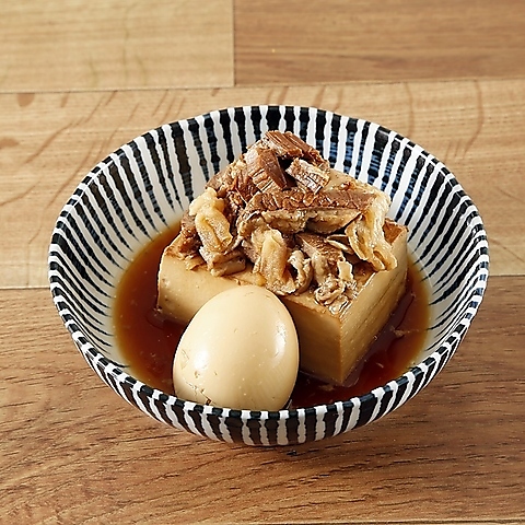 【名物肉豆腐】煮玉子入りの肉豆冨は、あっさりとした煮込みが特徴の一品です。柔らかな肉と滑らかな豆冨が絶妙に絡み、優しい味わいが口いっぱいに広がります。栄養満点で、ほっと心温まる一皿。ぜひ一度お試しください。生ビールとの相性抜群です♪