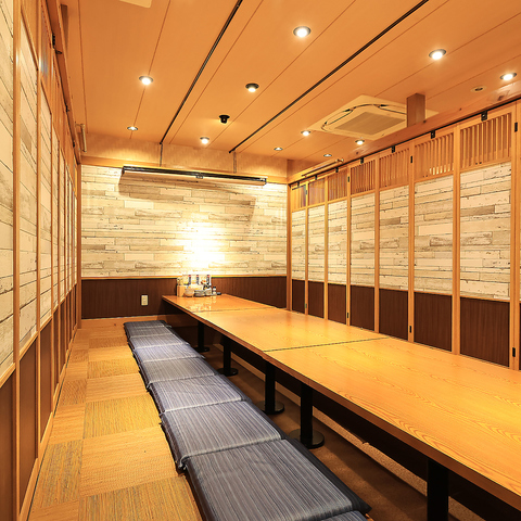 【ゆったり寛げる個室】長時間の宴会でも脚を伸ばしながら寛げる掘りごたつございます。快適な空間で大人数の飲み会にもしっかり対応◎宴会向けの飲み放題付きコース料理や、幹事様にも嬉しいクーポンも多数ご用意しております!仕事終わりにも気軽にお立ち寄りください。