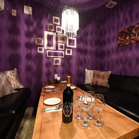 紫を基調とした壁面にシャンデリアが輝く、高感度なデザイナーズ完全個室。ゆったりとした黒のレザーソファーに身を委ね、非日常的なプライベートタイムをお過ごしいただけます。誕生日や記念日はもちろん、女子会や特別なおもてなしにも最適です。
