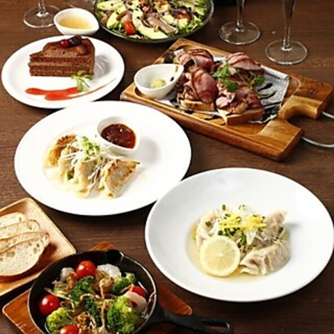 洋風前菜の生ハムマリネやレバーパテで華やかに開幕。無農薬野菜サラダに続き、看板の餃子3種(焼き・チェダー・水餃子)を贅沢に食べ比べ。メインは麻辣×鶏白湯の2種出汁火鍋!豚ロースや鶏もも、とろけるモッツァレラを堪能。〆は旨みが凝縮したチーズごはん、最後はアイスでさっぱりと。冬の味覚を欲張る全6品。