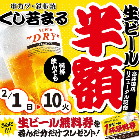 2/1(日)~10(火)期間限定で生ビールが半額159円に!さらに生ビール無料券を呑んだ分だけプレゼント♪