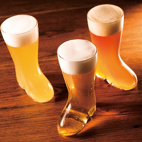 名古屋で1931年から続く老舗「浩養園」で造っているクラフトビール3種類をはじめ、国産クラフトビールをお楽しみいただけるお店です!クラフトビールの飲み比べセットを御用意♪「どのクラフトビールを飲めばいいか迷う!」という方必見!なんと3種類のクラフトビールが、ミニブーツグラスで飲み比べできちゃう!お得でかわいいセットです!