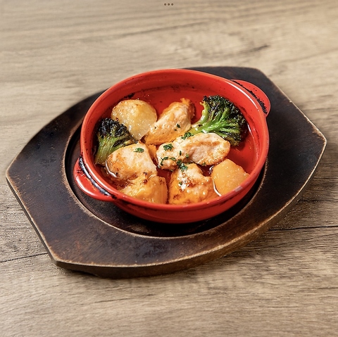 下味のついた骨付のたもも肉を丸ごと一本オーブンでじっくりと焼き上げます。皮目は少しパリッと、中身は肉汁が詰まってジューシー!「おや鳥」は歯応えがあり旨みが強く、「ひな鳥」は柔らかくふっくらとしてそれぞれ食感がちがいます。味の決め手は鶏肉のために調合し、スパイシーな風味をより引き立たせる「がブチキスパイス」。