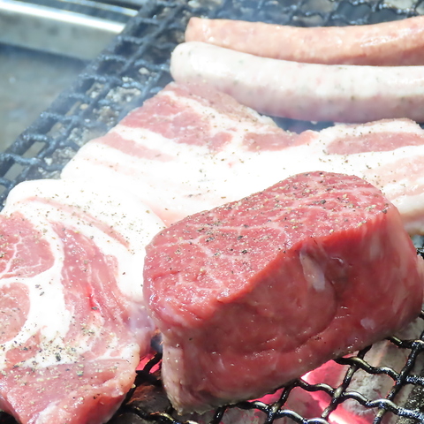 北海道産富良野和牛特選もも肉、姫路ブランド豚の桃色吐息炭火焼き