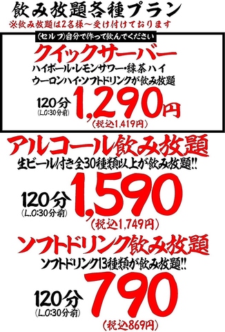 飲み放題120分1290円~ アルコール飲み放題やソフトドリンク飲み放題もあります