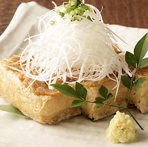 肉厚でボリューム満点の「栃尾のあぶら揚げ」。表面は香ばしく焼き上げ、中はふっくらジューシー。外はサクッ、中はふんわりの食感がクセになる一品です。お酒のお供にもぴったり!