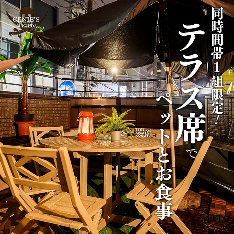 【テラス席:8名様×1卓】ご予約限定!ペットもOKのジーニーズ屋外テラス席。ご予約限定で、ジーニーズ2階のテラス席は屋外での飲食が可能!カップルやご家族に大人気で、なんとペットも一緒にご利用いただけます。お昼は心地よい日差しを浴びながら、夜は満天の星空の下でお食事を楽しめます。