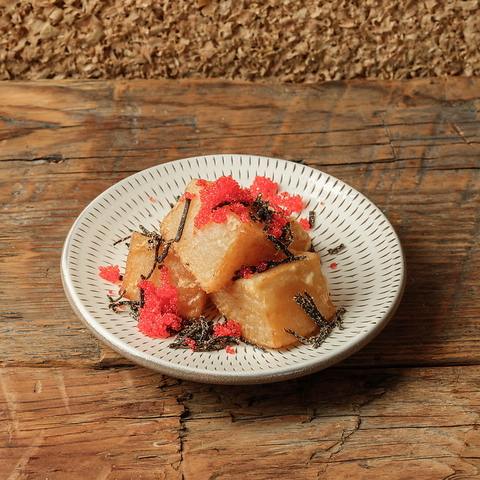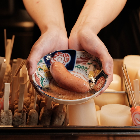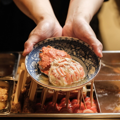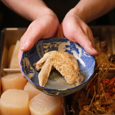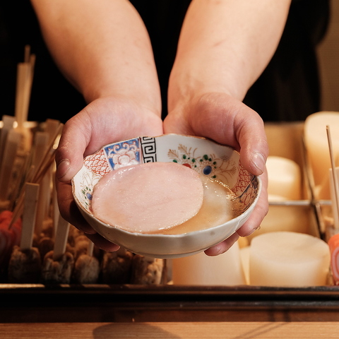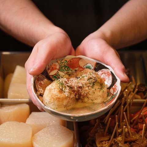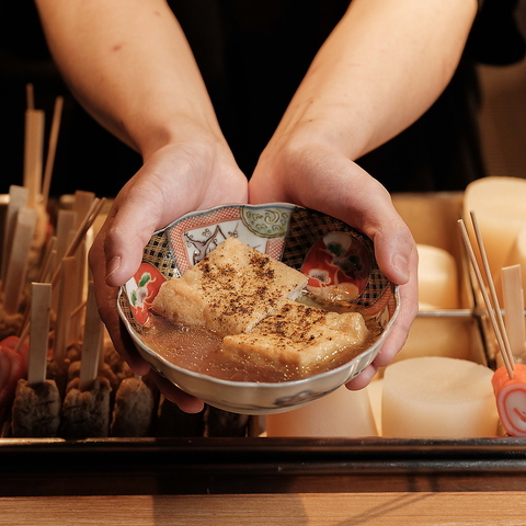 【2025/11/6~期間限定「おでんのカニ面」提供】毎朝継ぎ足す出汁と、五時間以上かけてじっくり仕込むことで実現される独自のレシピの絶妙なバランスにより、旨味が詰まったおでんをご提供します。