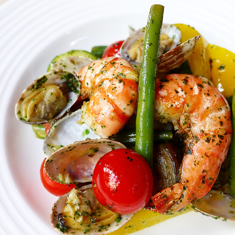 通常のシェアプランコースの中の一品が選べる内容となっております。当店のアヒージョはガーリックの他に旨味の元となる材料やスパイス等で独自のオイルを作っています。海老は殻ごと煮込むことでより深い味わいになります。お昼のランチタイム時でもご利用可能です。