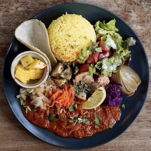 さらっとしたスープのスパイスカレー、副菜を混ぜて口の中でいろいろな味をお楽しみください