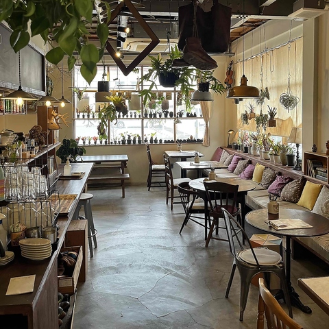 人気のスパイスカレーは男女問わず人気の一品。アンティーク家具と観葉植物でゆったりと落ち着いた店内。