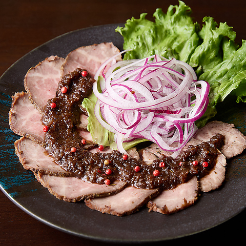 当店のローストビーフはローズマリーで香りづけをして焼き上げております!和風ソースとともにお召し上がりください。裏メニューで「ローストビーフ丼」もあり◎。