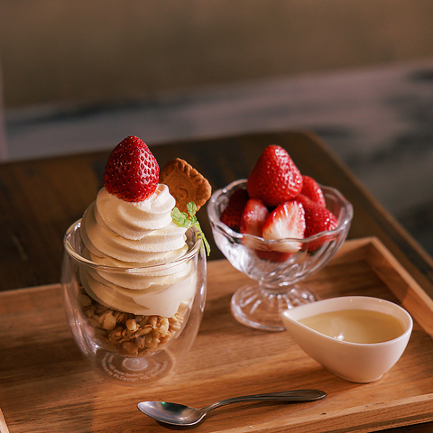 自家製のソフトクリームに旬のフルーツを贅沢にトッピング。見た目も可愛い人気スイーツです。夜カフェや女子会のデザートタイムにぴったりで、食後のひとときを少し特別に演出します。季節ごとに変わる限定スイーツもお楽しみに♪