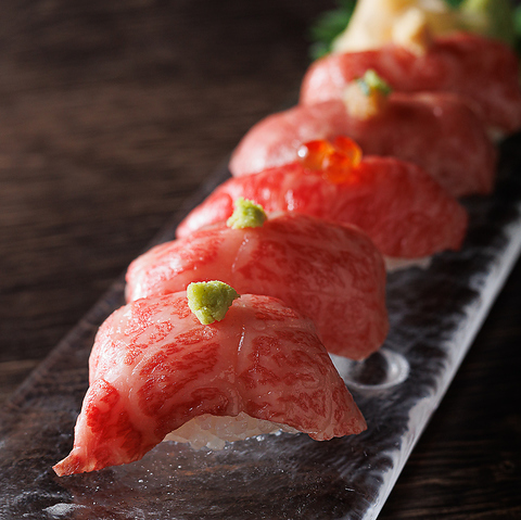 和牛肉寿司を各種豊富にご用意!部位ごとに異なる味わいを、少量ずつ多彩に楽しめるのが当店ならではの魅力です。無菌室で丁寧にさばくことで鮮度を徹底管理しているため、生でも味わえるほど新鮮な和牛をご堪能いただけます。さらに希少部位のご提供もございますので、肉好きにはたまらない贅沢なひとときをお約束いたします。