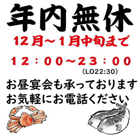 12月~1月中旬までは12:00より営業致します。 繁忙期ですが比較的ゆっくりお食事できます。 お昼宴会も承っております。