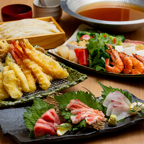 天ぷら盛り合わせに自家製麺うどんまで多彩なドリンクと楽しめるコース。お刺身付きのコースもございます。