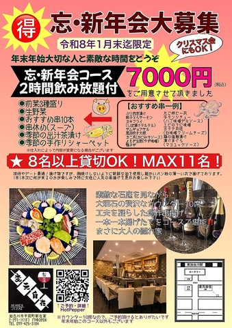 令和8年1月末迄限定!【忘・新年会コース2時間飲み放題付き7000円(税込)】をご用意★詳細はご確認下さい。