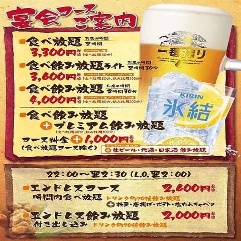 22時以降からは、ラストオーダーまでハイボール・酎ハイ・カクテル各種などの豊富なドリンクを楽しめるエンドレス飲み放題コース2000円(税込)がとってもお得でおすすめ◎夜の遅い時間帯でも安心してご宴会を楽しめます!お友達との飲み会・急な宴会など、様々シーンでご利用ください♪