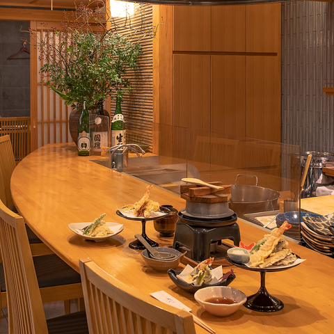 大人の上品な空間…。料理長が目の前で揚げたできたての天麩羅をお召し上がりいただけます。こだわりの衣と厳選の季節食材で上質なサクサクの天麩羅をお愉しみください。接待、各種ご宴会はもちろん、デートなどにも最適です。
