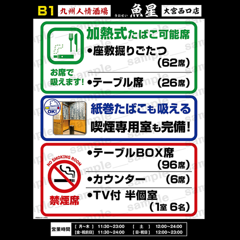 【喫煙について】加熱式たばこのみご利用いただける喫煙席を増設いたしました。また、店内には紙巻たばこも吸える喫煙ルームを完備しております。分煙対策を徹底しているので、喫煙される方もそうでない方も安心して快適にお過ごしいただけます。※一部の座敷席は、電子タバコのみ喫煙可能です。その他は全席禁煙です。